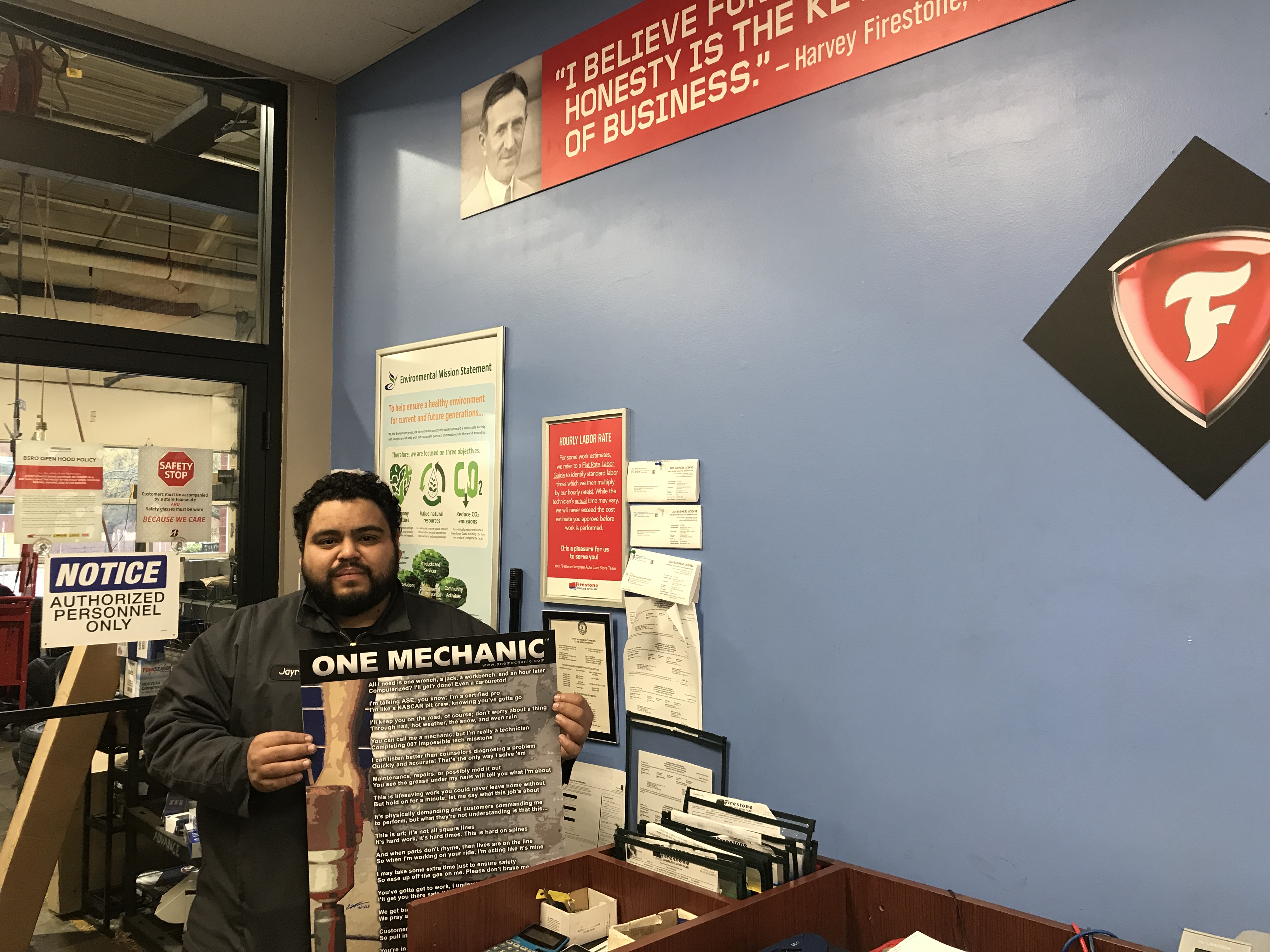 Firestone Complete Auto Care 2755 Metro Plaza 22192 | 703-490-0500 (2025: *Jayro Morales, Store Manager; 2019: *Josh, Store Manager; *Lowell, Technician pictured; 2011: *Grayson Williams; *Edwin Alvarez; Carlton Hughes; *Dion A. Harris, Service Mgr; *Dwight Jackson, Master Technician)